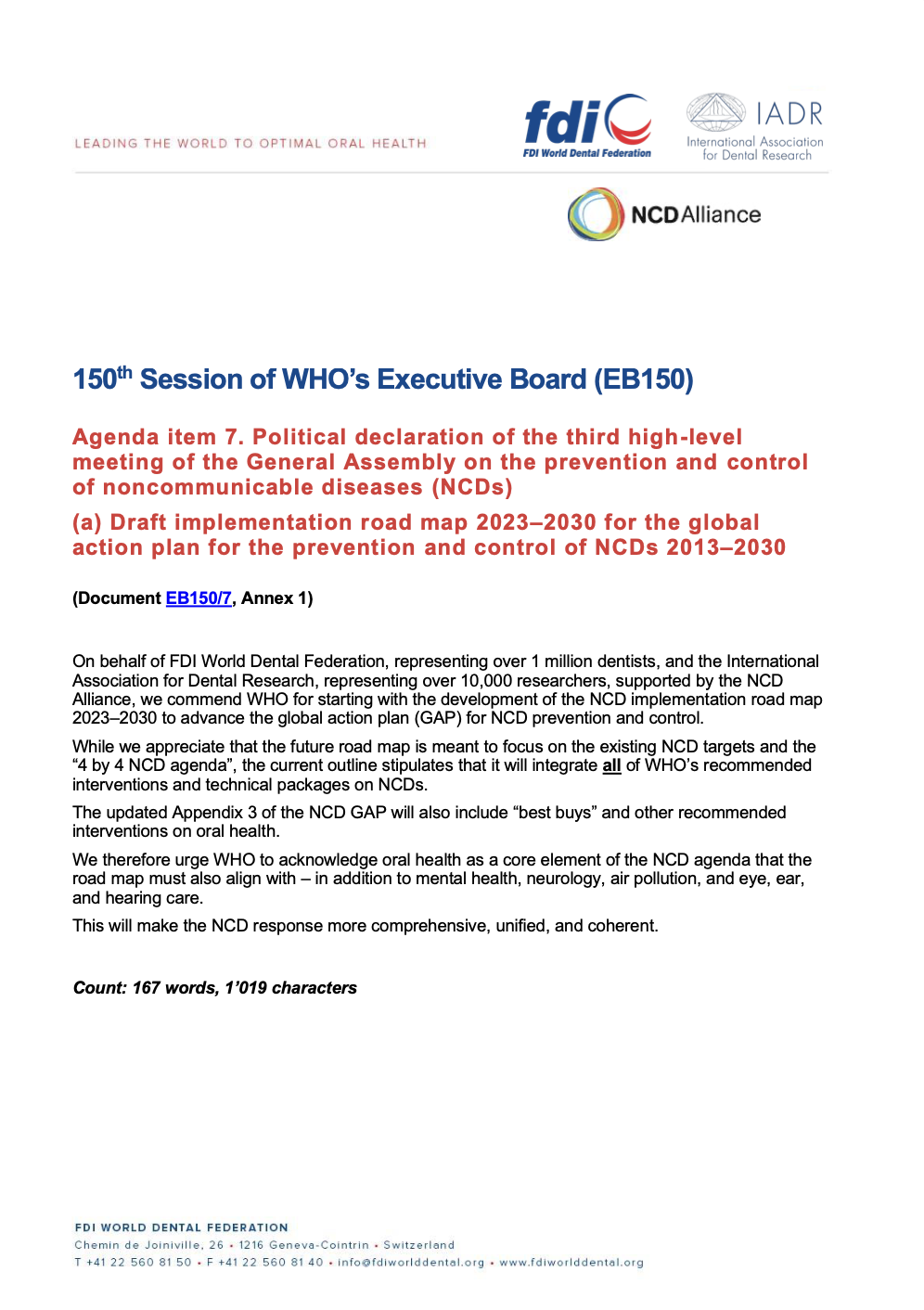 FDI and IADR statement on EB150 Item 7 - NCD implementation road map 2023–2030